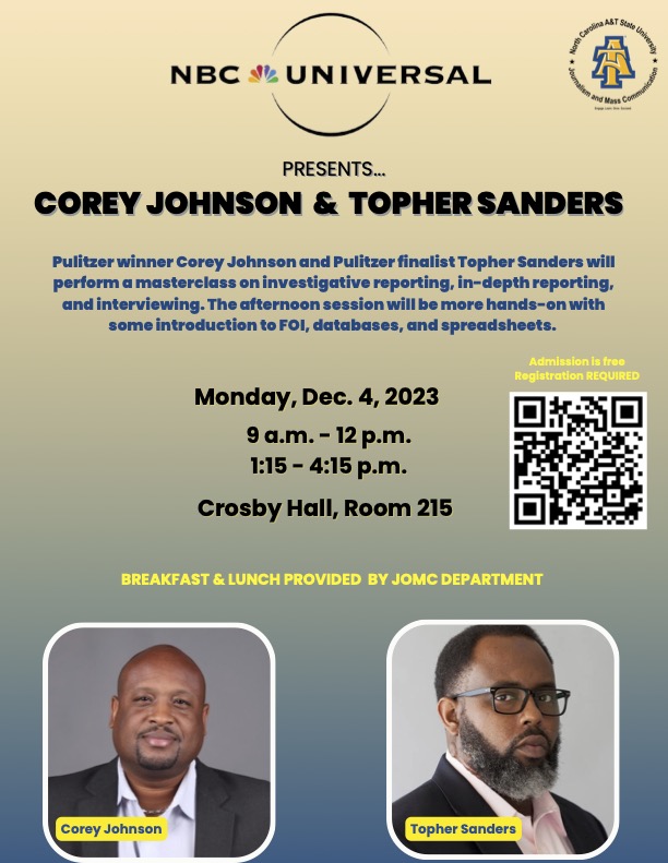 Topher Sanders & Corey Johnson will lead investigative reporting segments at the NBCUniversal masterclass Series on Monday, December 4. Journalism students will be able to soak up valuable information in Crosby Hall, Room 215. The day-long event will be split into a morning and afternoon session.