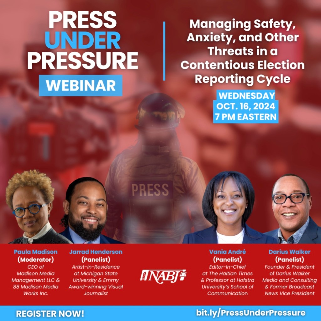 The National Association of Black Journalists is hosting a webinar titled Press Unde Pressure on Wednesday, October 16, 2024, at 7:00 pm EST.