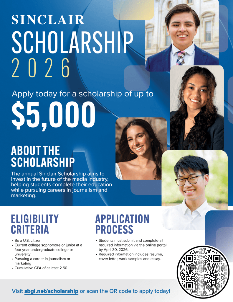 The 2026 Sinclair Broadcast Group scholarship application is open for one more month. This one-time scholarship is for up to $5,000. Students pursuing careers in journalism, digital storytelling, and marketing are encouraged to apply.